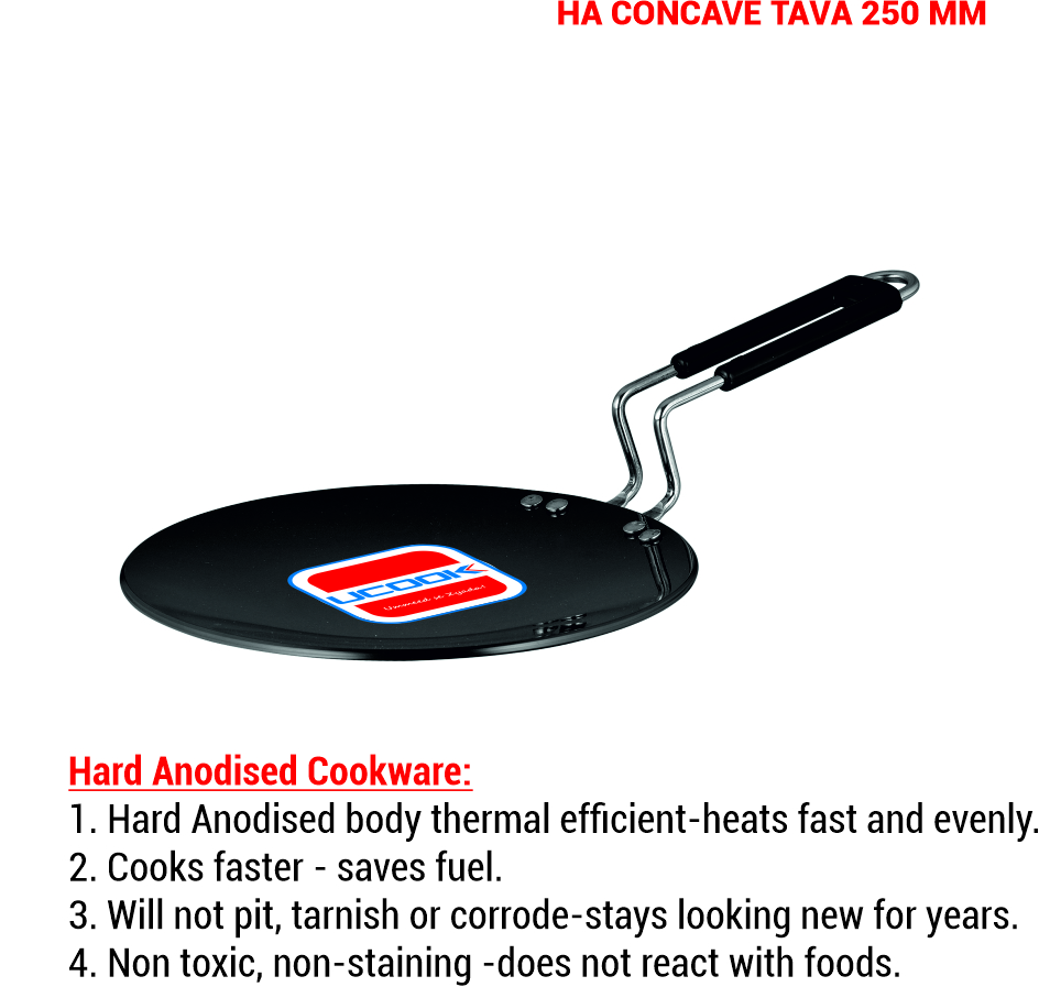 Hard Anodised Aluminium Concave Tava 250 mm /4.06 mm with superior strength and durability. It has a cool touch and strong handle for better grip. The base is designed for uniform heat distribution. It keeps the temperature in control and avoid burning of food.