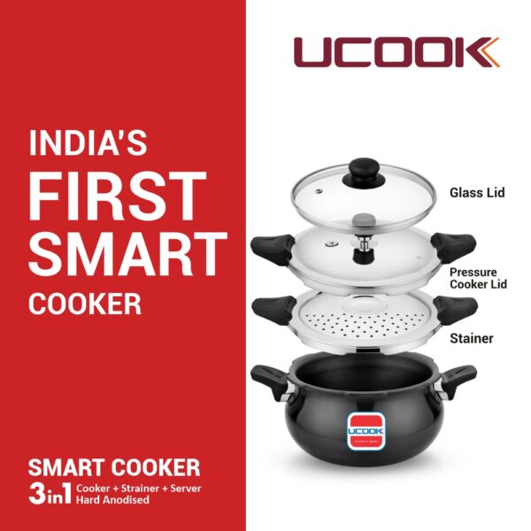 UCOOK Smart 3-in-1 5L Hard Anodised Handi Pressure Cooker , Induction, Strainer, Glass Lid, Black